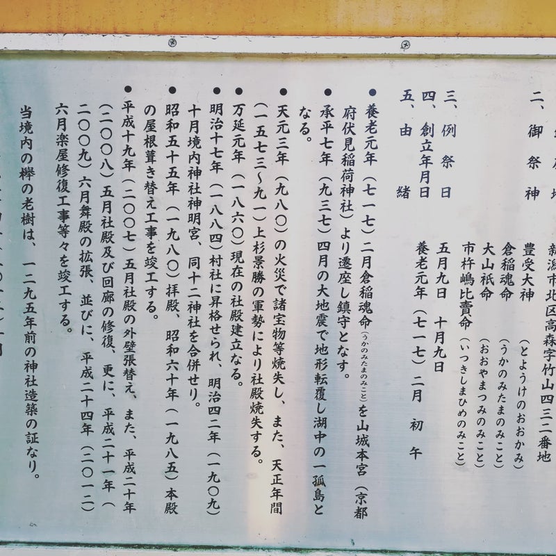 しかし、由緒書きを拝見する限り…大地震でこの丘のみ湖中の孤島と化したり、火災で宝物を焼失してしまったり、はたまた戦国時代に上杉景勝の軍勢により社殿を焼かれたり…と、まさに波乱万丈だったようです。