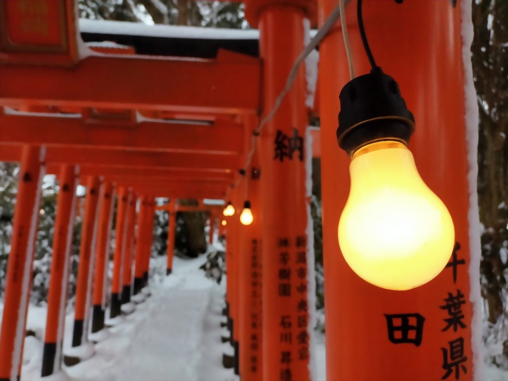 森の中の奥の院も、この日ばかりは雪化粧に加えて、どこか懐かしさを感じる裸電球でドレスアップです!