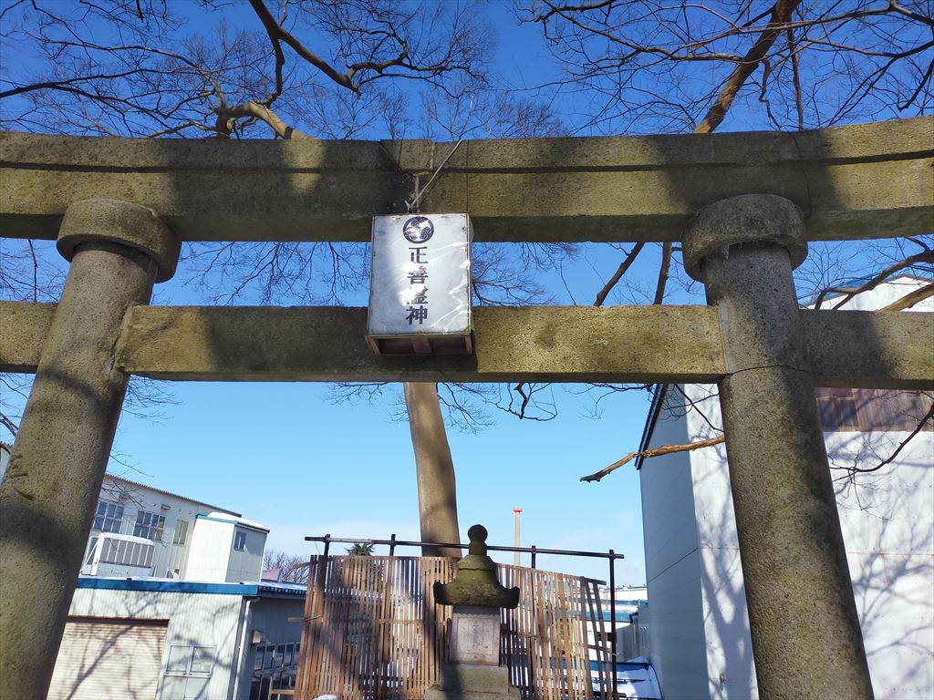 「正善霊神」と記された案内板から石段が続き、石段の先には石造りの鳥居が見えます。