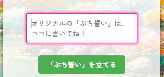 「うーん、どれもちょっと…」という時は、選択肢の一番最後にある「オリジナルのぷち誓いはココに書いてね」欄に、自由にあなただけのぷち誓いを書いてくださいね!