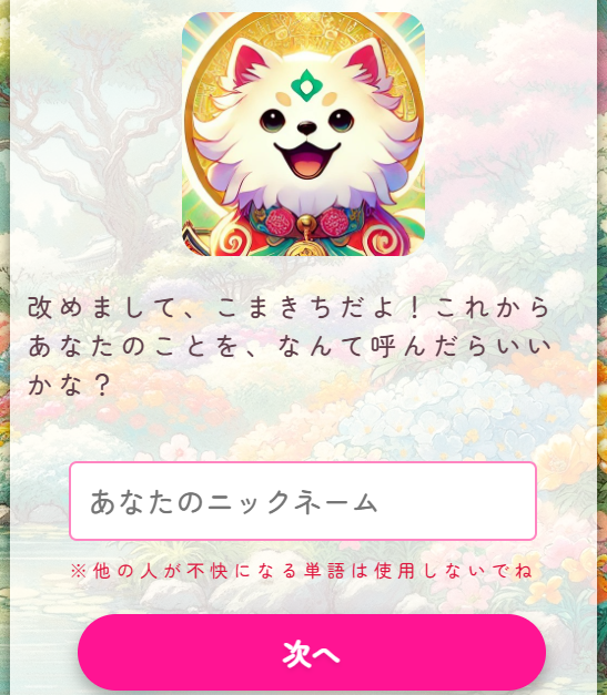 先ほどあなたのしゅごモンにニックネームをつけてあげた時と同じ要領で、今度はあなたのニックネームを入力して「次へ」ボタンをタップしてください。