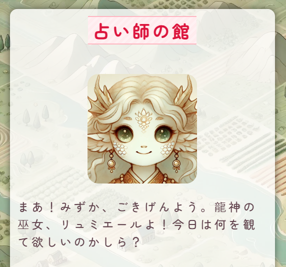 「占い師の館」はしゅごモンカードお守りWEBアプリ内のコンテンツで、占いたい人物の氏名(苗字と名前)、生年月日を元に龍神の巫女リュミエールが不思議なカードでその人物の性格や運勢、潜在能力などを占ってくれる占いです。
